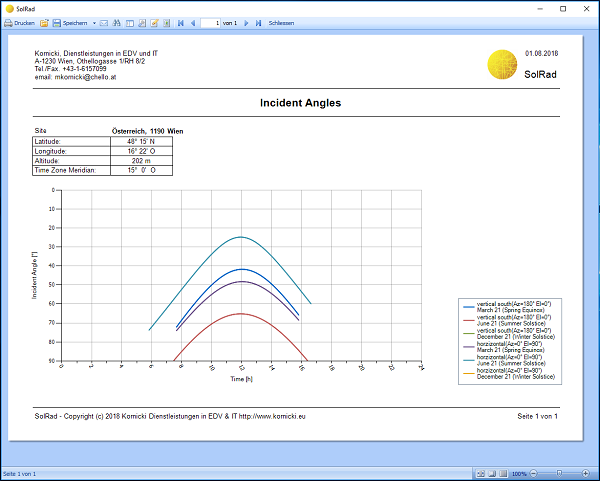 położenia Słońca (drogi Słońca), natężenia naświetlenia (natężenie promieniowania słonecznego) w odniesieniu do dowolnego położenia i nachylenia w kierunku ziemi oraz czasu trwania godziny słonecznej (ekspozycja na słońce) biorąc pod uwagę efekty cienia. (Zacienienie horyzontu-odbicie promieniowania.)